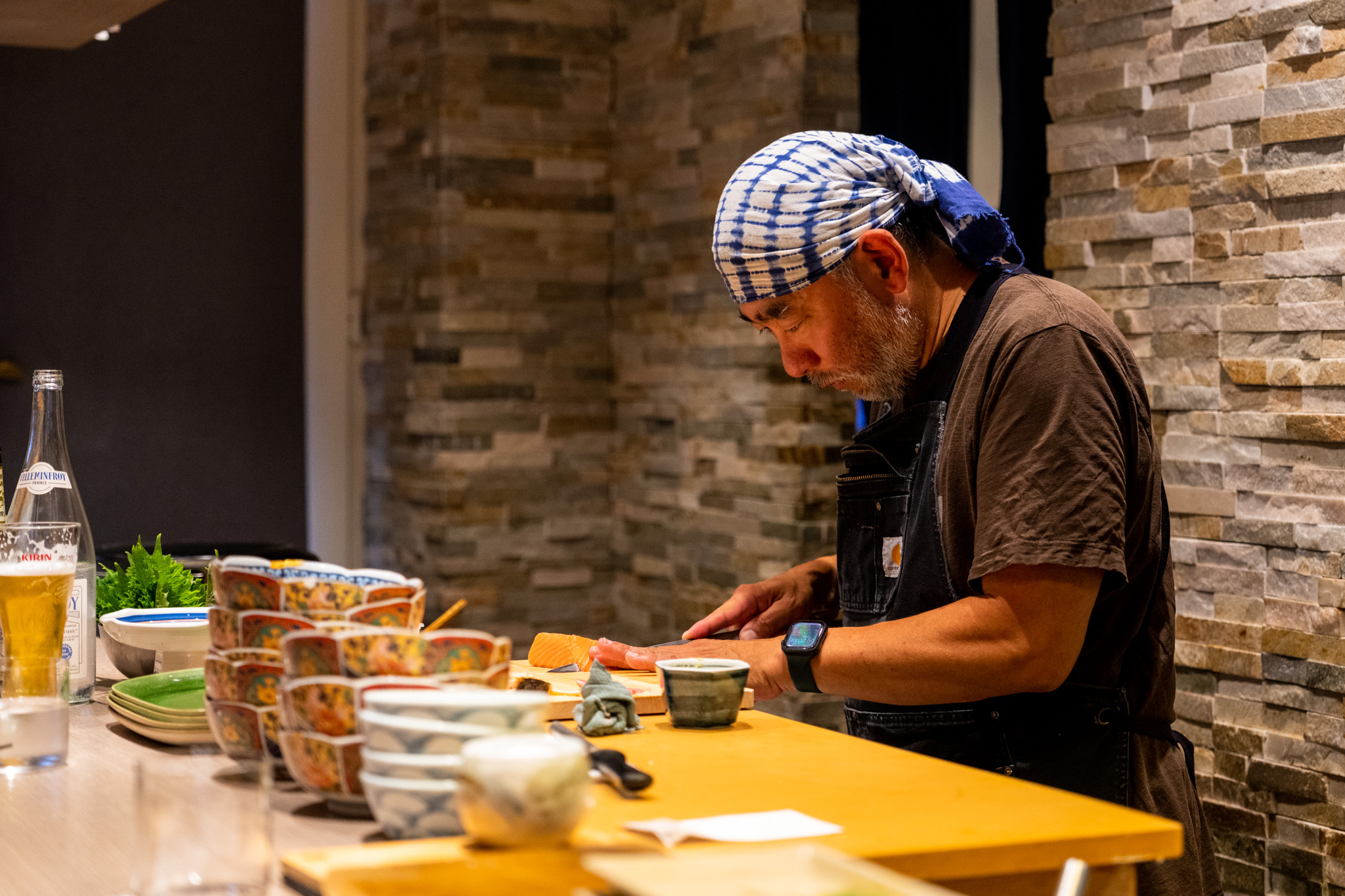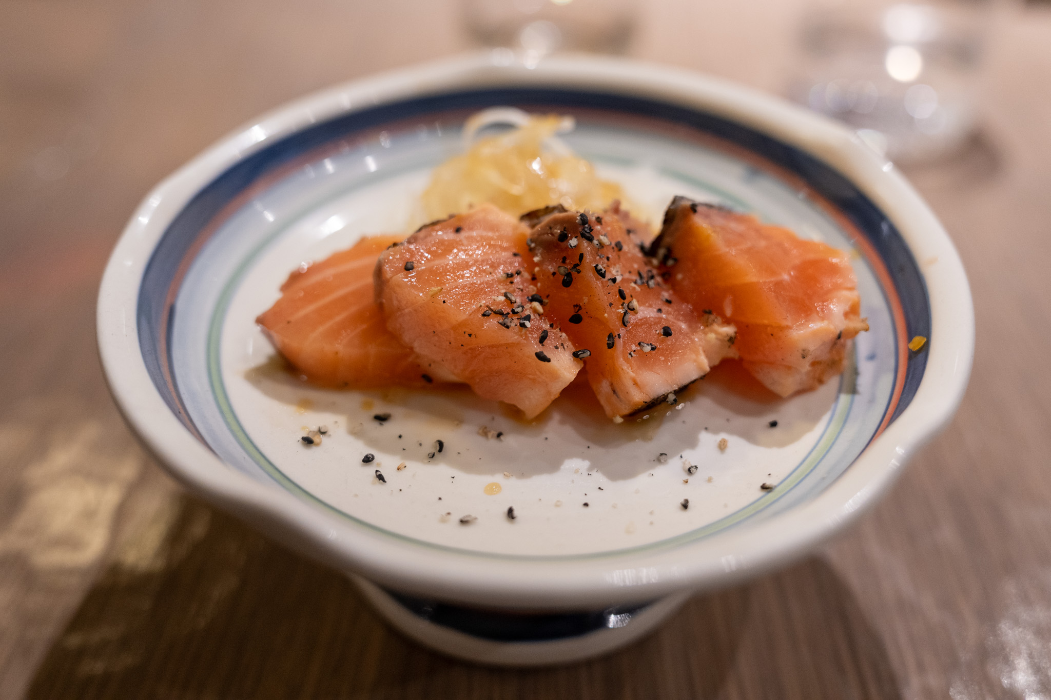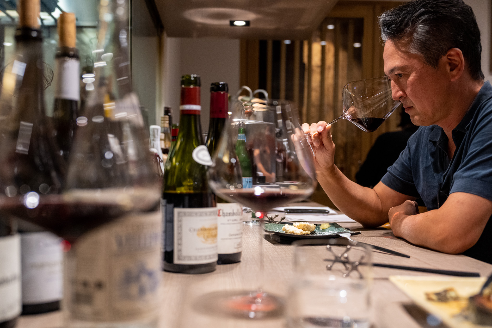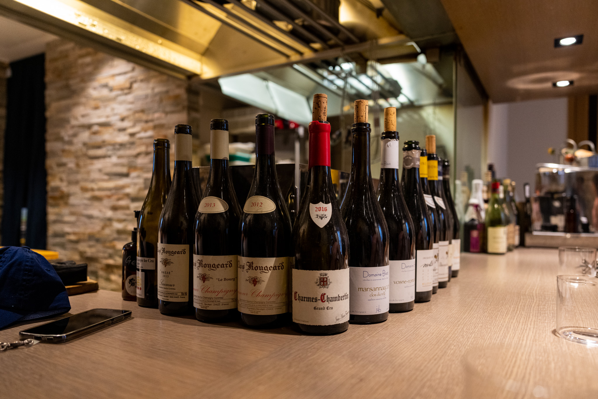 カウンターに座ってすぐ目に入るワインのボトルがここがブルゴーニュの和食屋ということを認識させてくれる。和食とワインっていつぶりだろう?たまらない。
