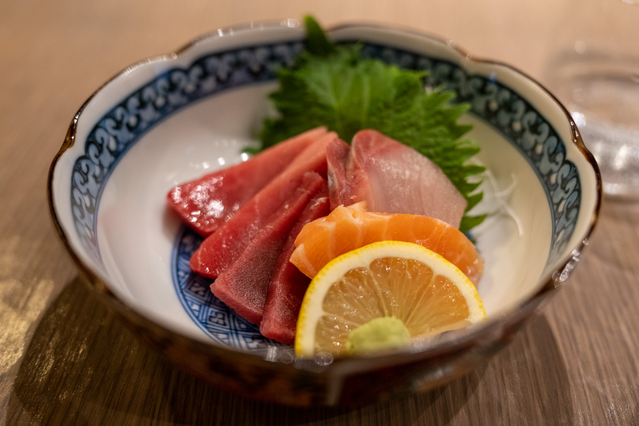 まずは刺し身の盛り合わせ。マグロの鮮度がよくて薄らと光っている脂がたまらない。