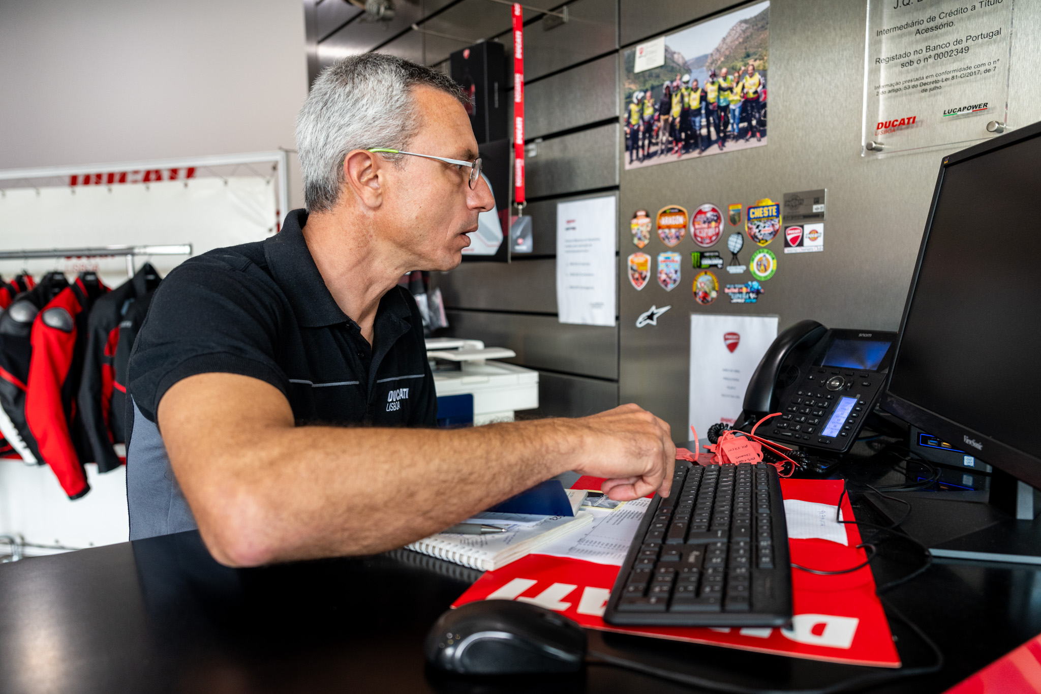 作業をやっている間に事務作業を進める。車体番号以外にもDucati Codeなども確認して正確に入力作業を行う。ディーラーが近くても徹底的にユーザー管理を行っているのがすごくいい。