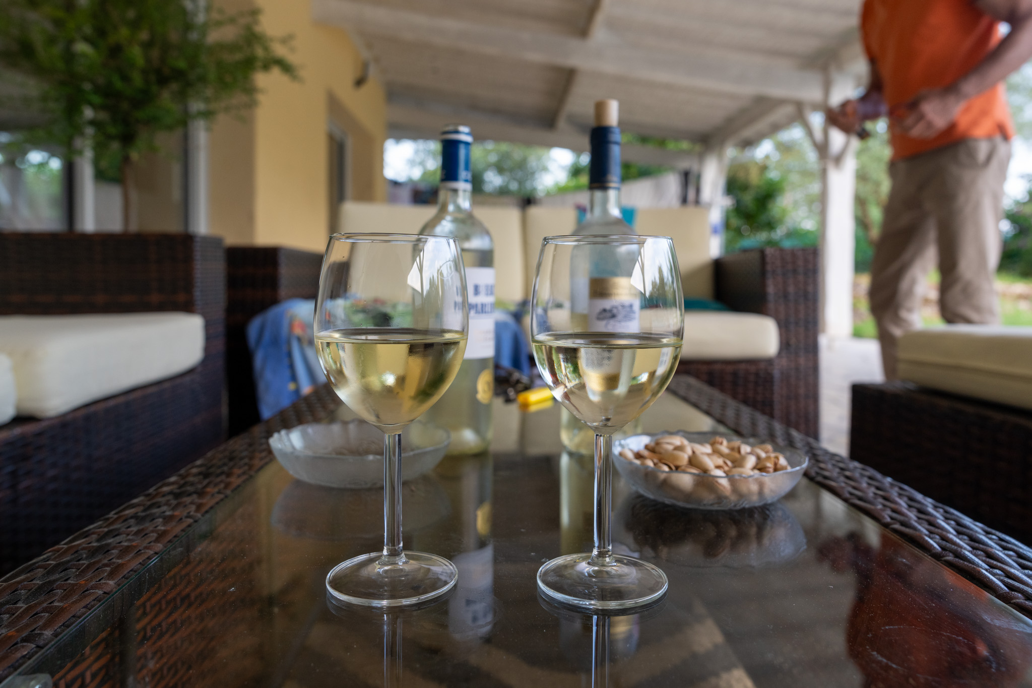 プール遊びの後は早速晩ごはんの支度へ。まずはワイン選びから。さすがフランスのワイナリーのオーナーだけあって白ワインを2種類、甘口と辛口を用意してくれて味見をして口に合うものを選ぶようにしてくれた。なんと贅沢な晩ごはんのスタート。食事にはドライなのが合いそうだったので辛口に。