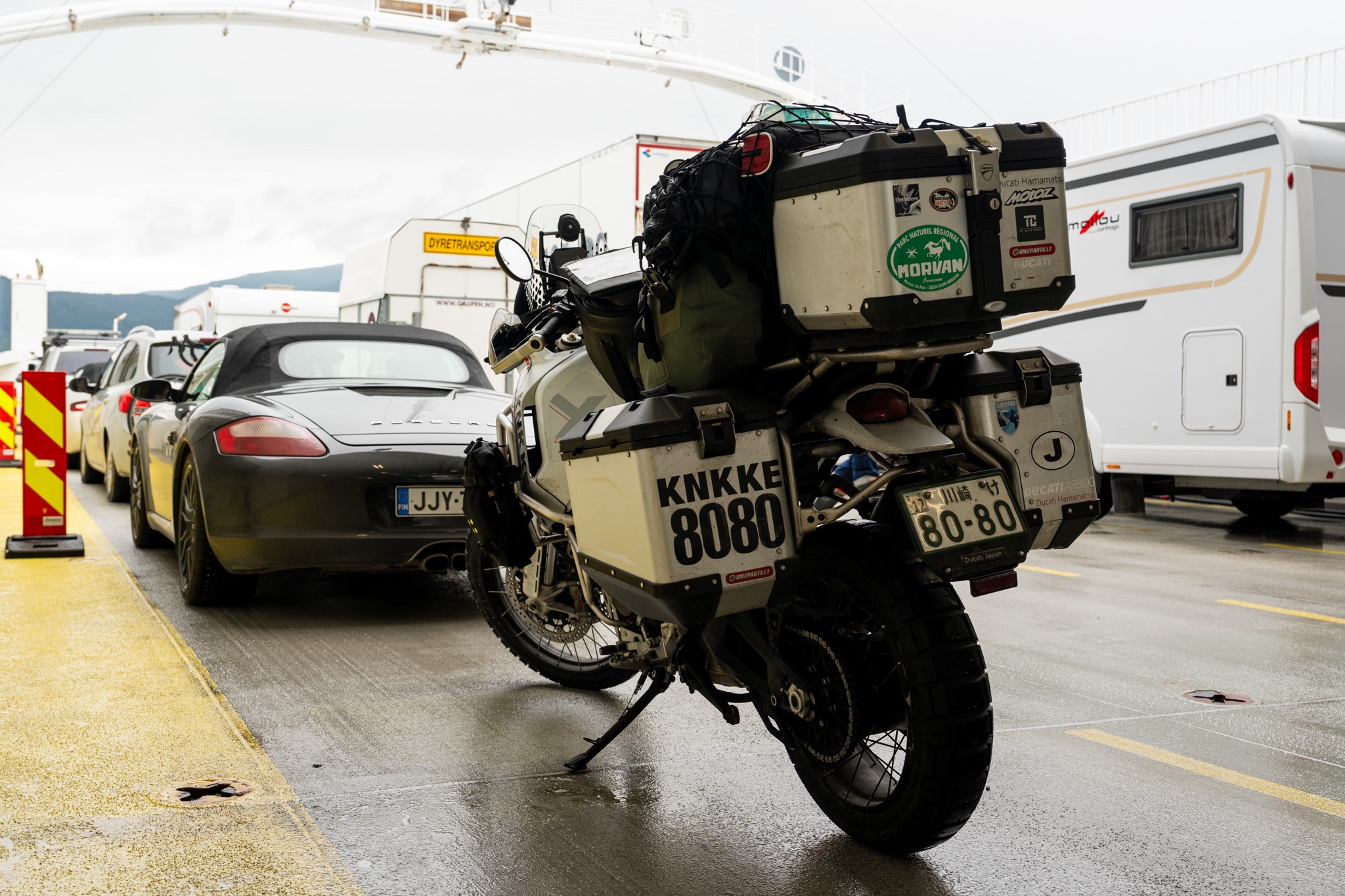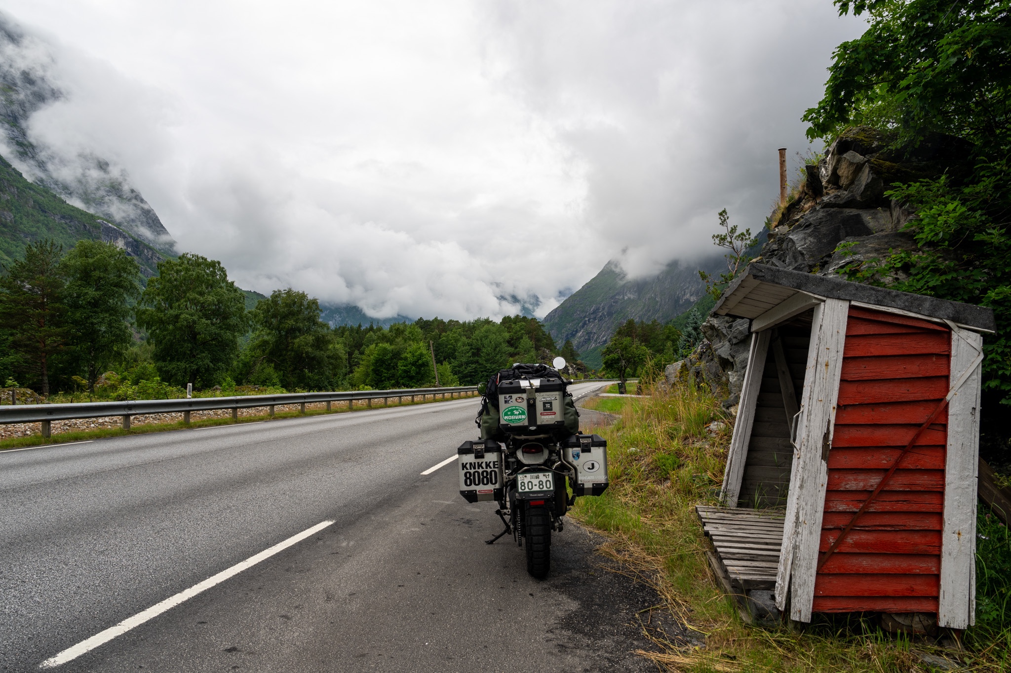 やっとバイクを停められるスペース(バス停)を見つけて記念写真を一枚。すごいスケールの景色なのにノルウェーではあまり大したことないのか展望台のようなものは一切なかった。また雲に隠れて写真ではその迫力があまり伝わらないのがもどかしい。