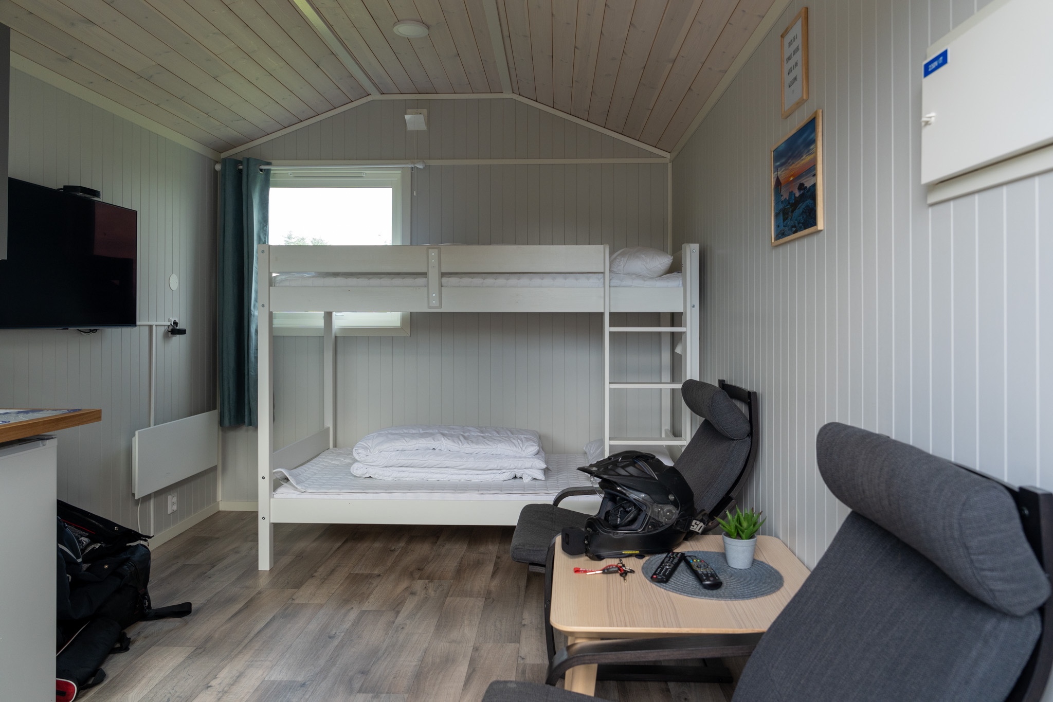 中は二段ベッドと小さいキッチンがあってテレビや寛げる椅子まである。