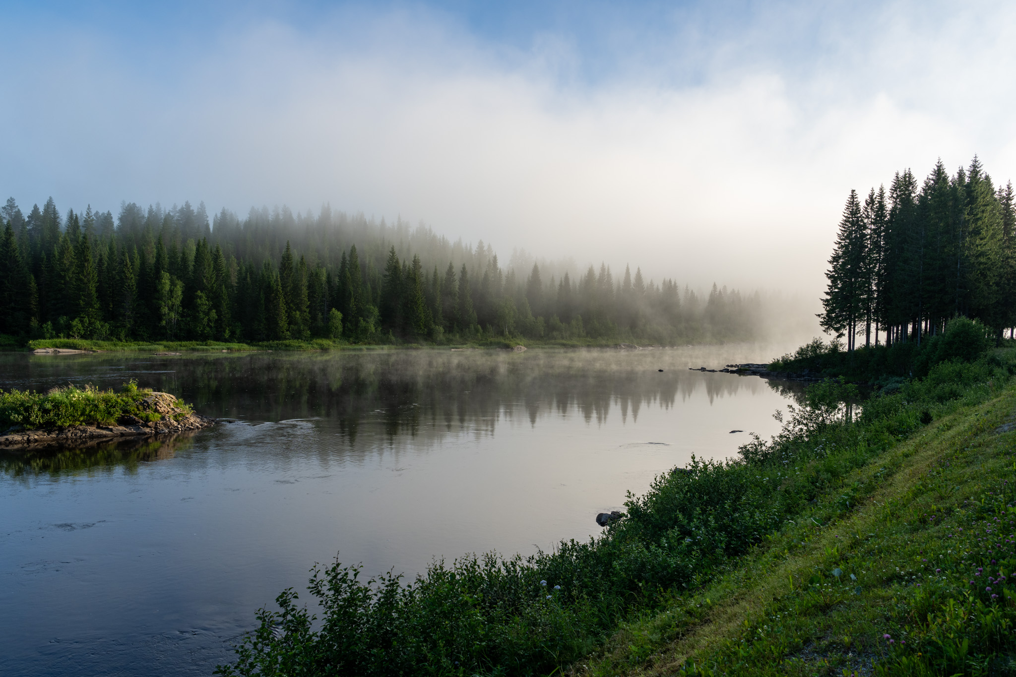 キャンプ場を出たのが朝の5時。寒暖差のせいなのか霧が結構厳しかった。それも霧と晴れの区間がはっきり分かれていて不思議な感じ。川霧が美しかったのでバイクを停めて一枚。