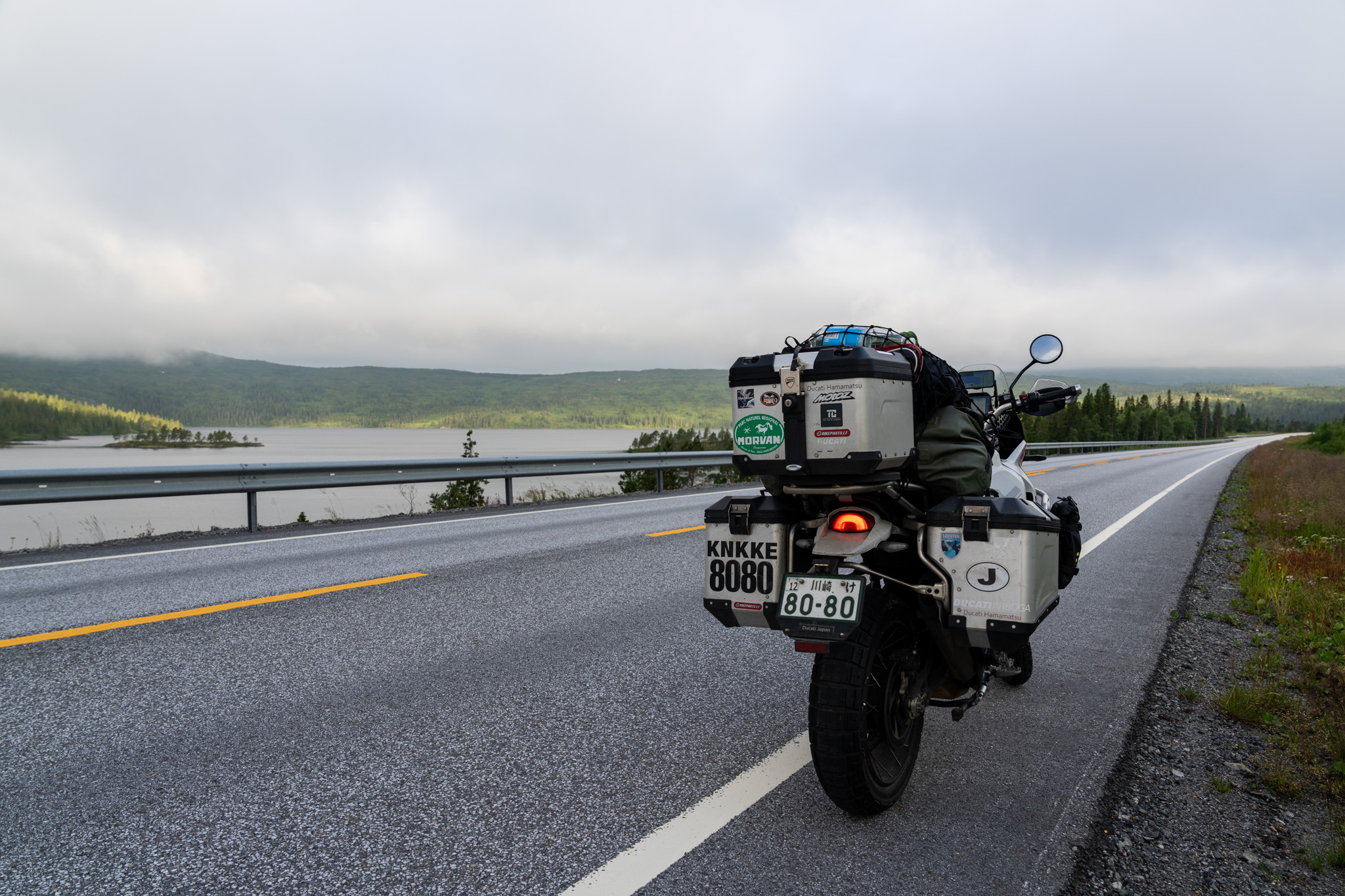霧が無くなったら晴れることを期待したが、また曇ってきた。その曇の中でも一瞬雲が無くなって晴れ間が出る瞬間があって湖の色の景色が綺麗だったのでまたバイクを停めて写真を一枚。ノルウェーの針葉樹の森はその密度が高くて見渡せる所が全部森なのでかなり迫力がある。