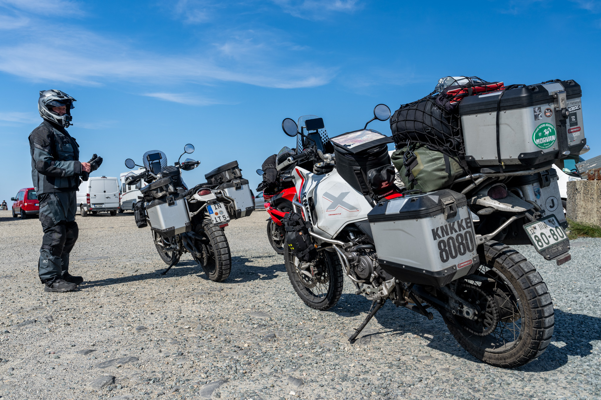 お!駐車場でなんとDesertXと遭遇した!ノルウェーでは初めて!実はノルウェー北部はアドベンチャーバイクの天国で数えきれないくらいのアドベンチャーバイクとすれ違ったが、DesertXは一台もなかった。ほとんどがBMWのGSシリーズでその人気の高さはすごかった。アフリカツインやテネレもちょこちょこ会えるし、モトグッツィのV85 TTさえ何回が会えたのにDesertXはこれが初めて。ドイツからいらっしゃった方で挨拶して少し会話をしたが、もう出発するタイミングだったので2台の記念写真だけ撮らせてもらってバイバイ。いや、これは嬉しい。