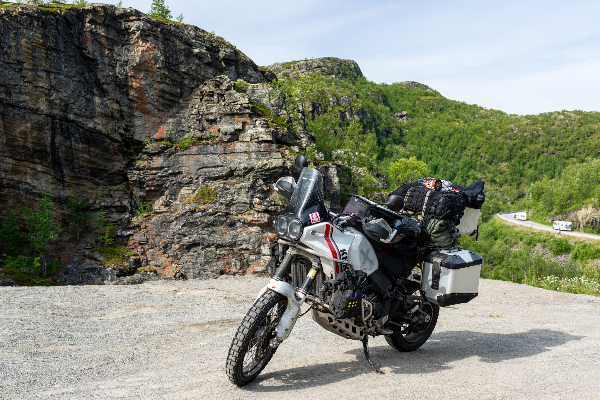ノールカップからムオニオまでは約490km。またノルウェーとフィンランドでは時差もあって1時間を返却しなきゃいけないのでいつもより少し早めの朝8時に出発した。朝から晴れて風もあまりないのですごく快適。昨日来た道をまた走って戻るのだが、それがなかなか楽しい。
