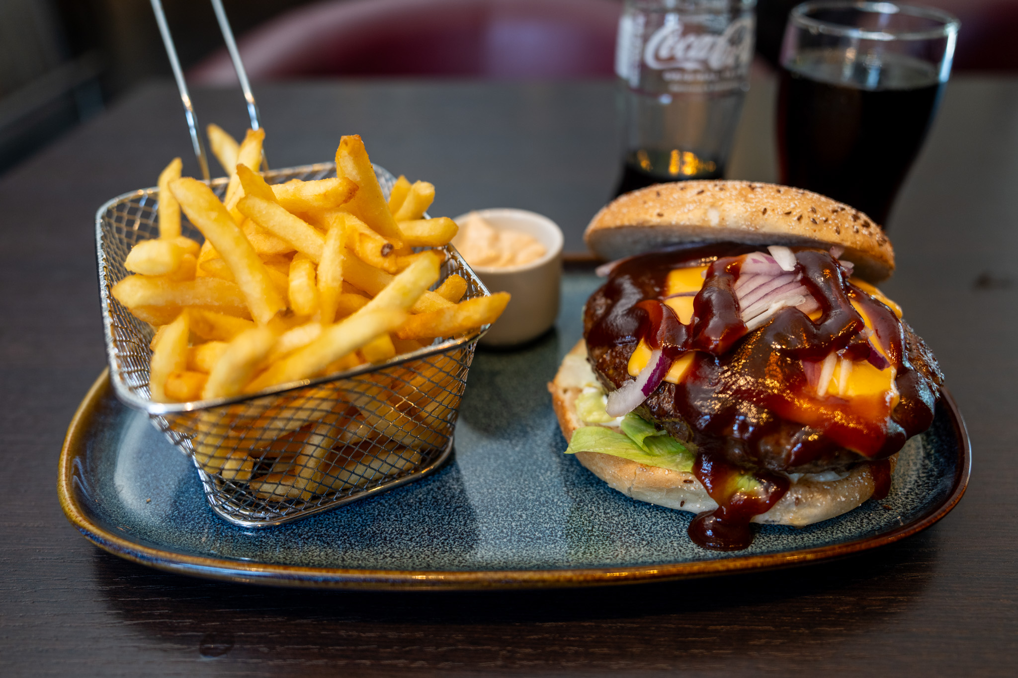 ちょうどよさそうなレストランがあったので入ってみた。テラス席もあって混んでいたが、日差しが強かったので店内で。ステーキとハンバーガー、ピザがメインのお店でランチだったので自家製ハンバーガーを頼んでみた。オリジナリティーがあってパティに使われた肉の質もよくてかなり美味しかった。