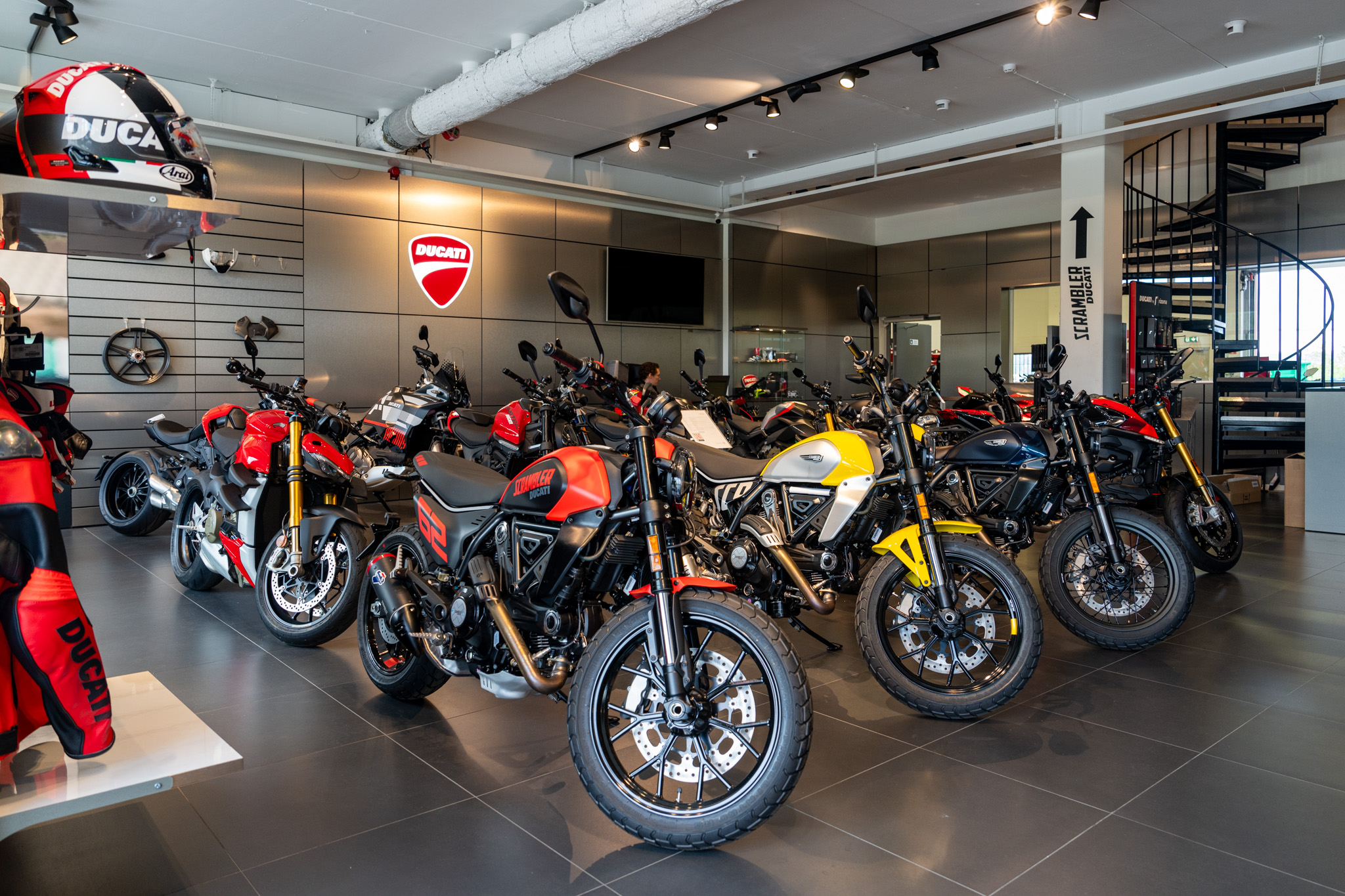 2階に待合スペースがあって整備が終わるまで寛げるようになっていてそこにもまたスクランブラーの専用スペースがあった。やっぱり推しているね。