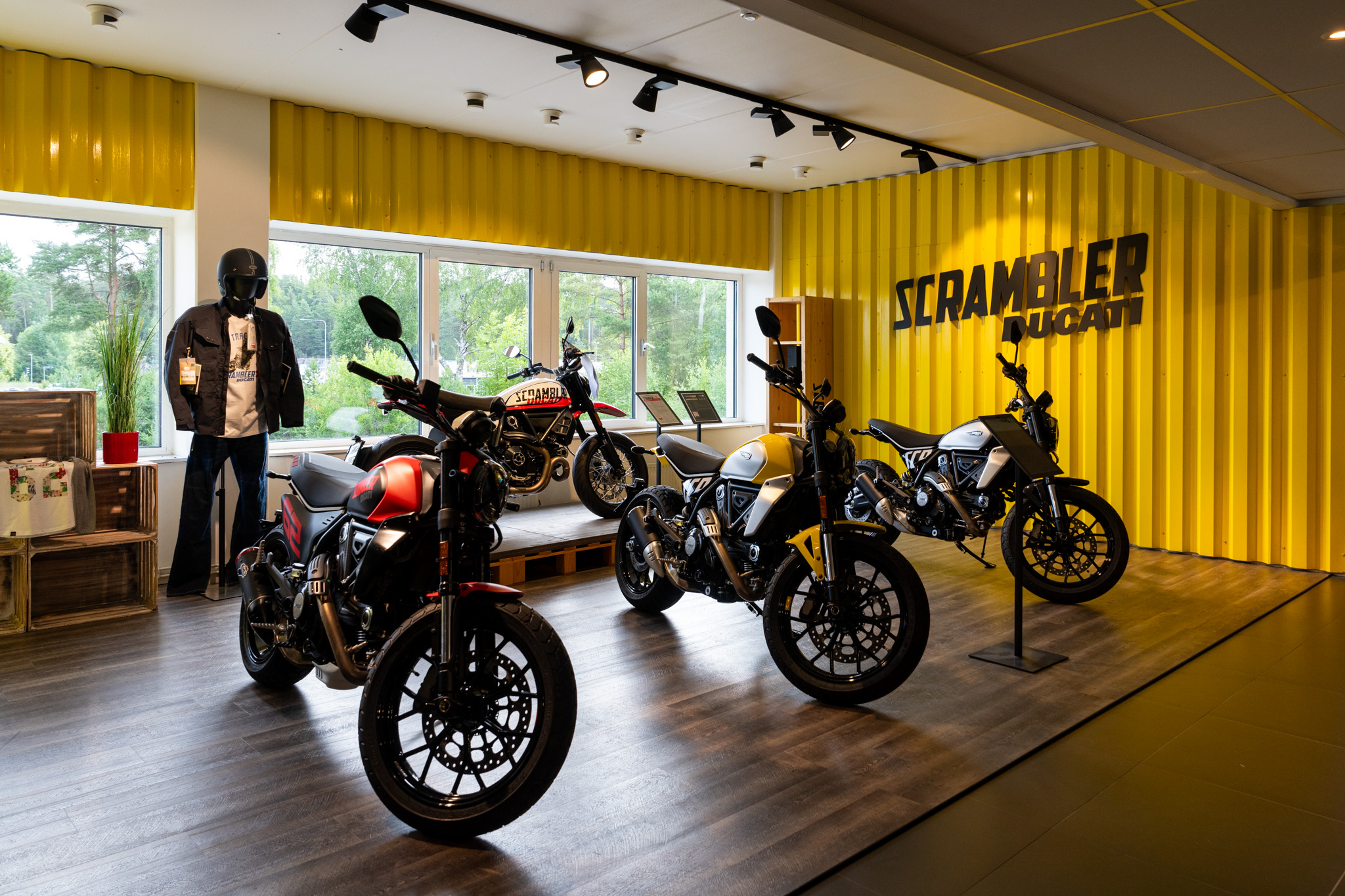 店内は結構広くてたくさんのバイクが展示されていた。イチオシはスクランブラーなのかな。桑野さんも一目惚れで衝動買いするくらいだからやっぱり売れているのかもね。