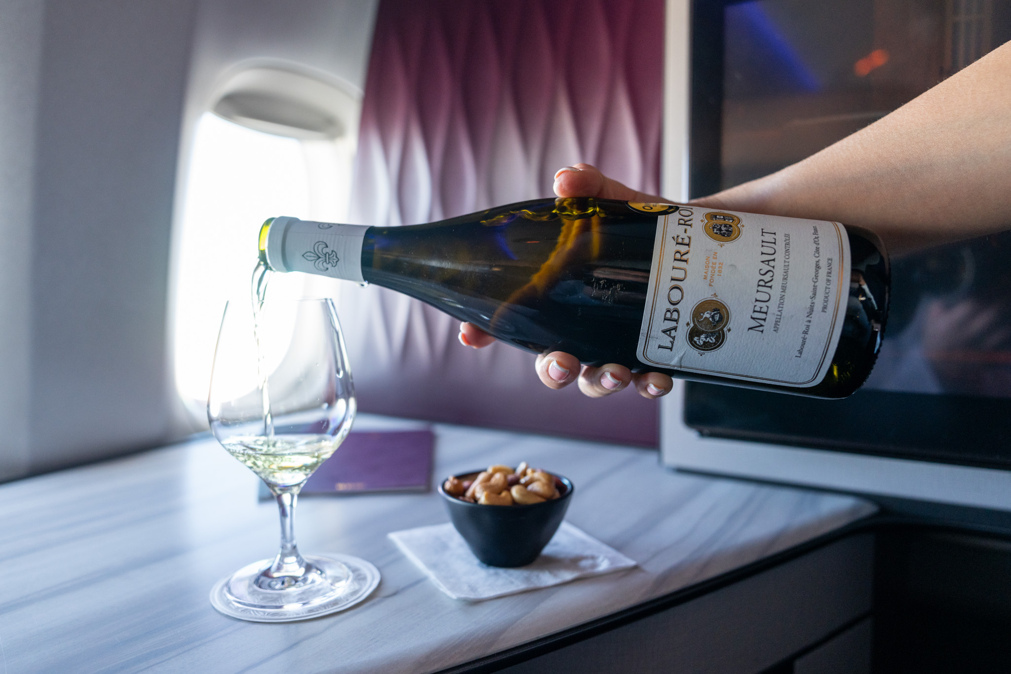 またパリ・ドーハ間とドーハ・羽田間ではワインリストが違ったのでここはムルソーのホワイトワインを頼んでみた。ラブレ・ロワ(LABOURE-ROI)のムルソー2020はしっかりいい香りだった。美味しい。