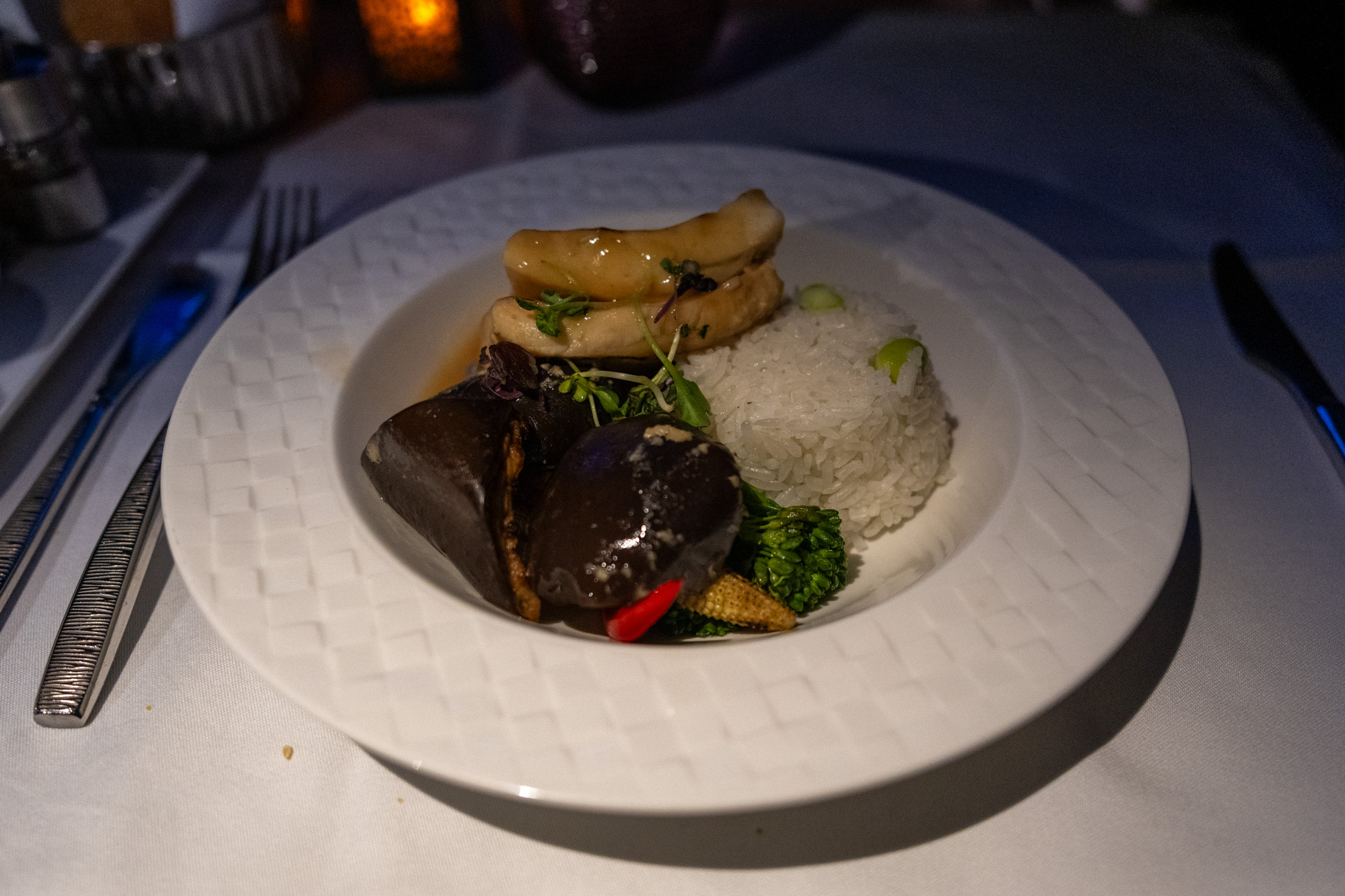 ラウンジで牛肉をいただいたのでここではカタール風のチキン料理を頼んだ。カタール料理は初めてだったが、普通にレベルが高くて美味しい。向こうの有名シェフが監修したらしい。