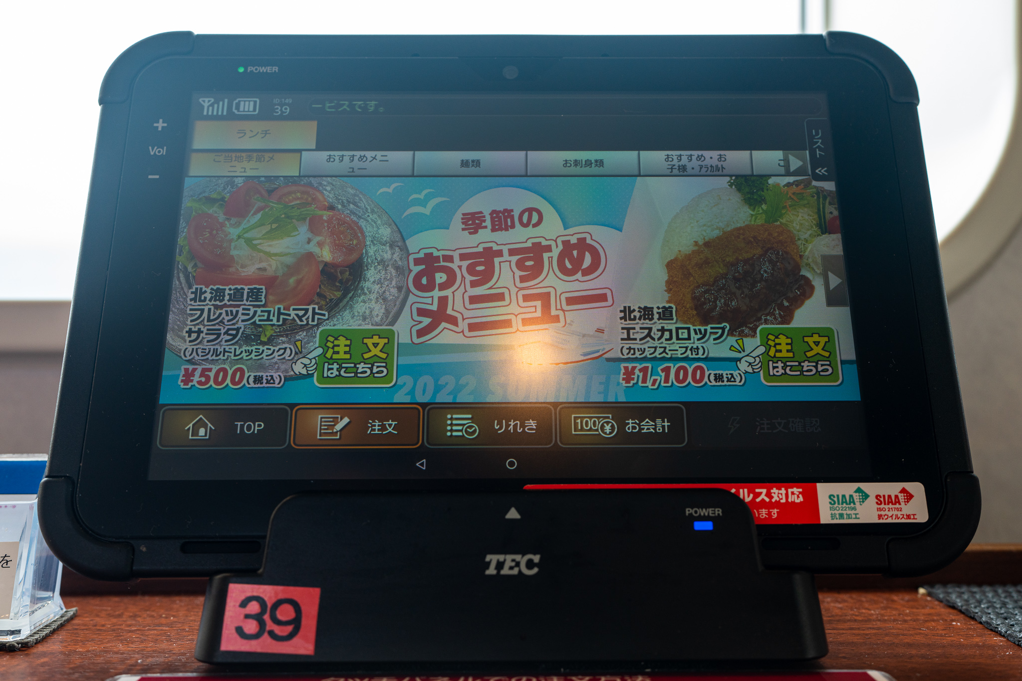 乗船が遅れたので風呂から出てきたらもう1時が過ぎていてお腹が減ったのですぐ食堂へ。去年はカフェテリア式で自分で好きなものを選んで食べる形式だったのに今年はタブレットで注文するスタイルに変わっていた。コロナ渦によるDXの波なのか!(去年もコロナ渦の最中だったが…)