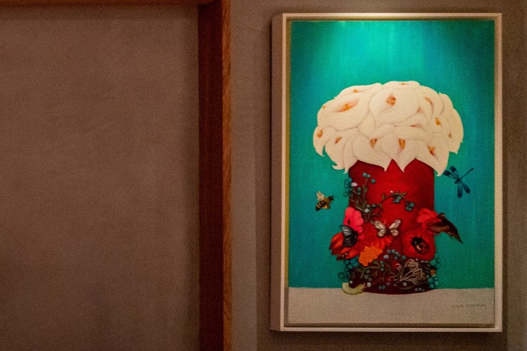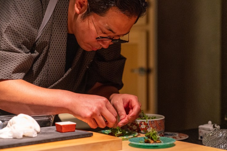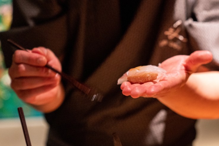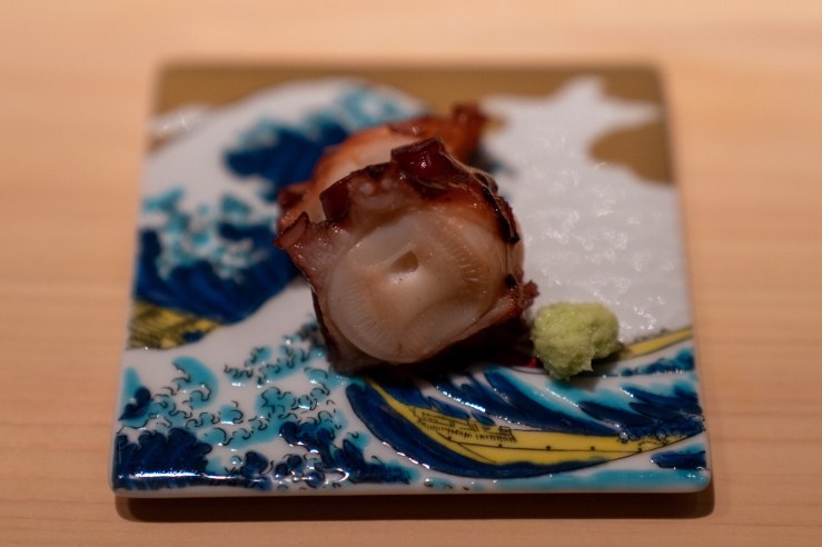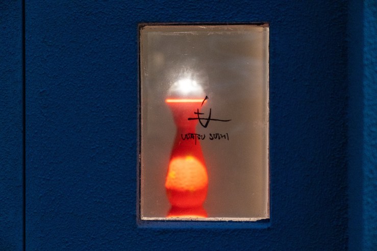 少し重めのグレーと木の扉がただものではない雰囲気を漂うファサードはただものではないことを教えてくれる。店内に入ると薄暗いなか、インパクトある絵がすぐ目に入る。後、少し大きめのJazzがBGMとして流れて普通の鮨屋ではないことをアピールしてくる。