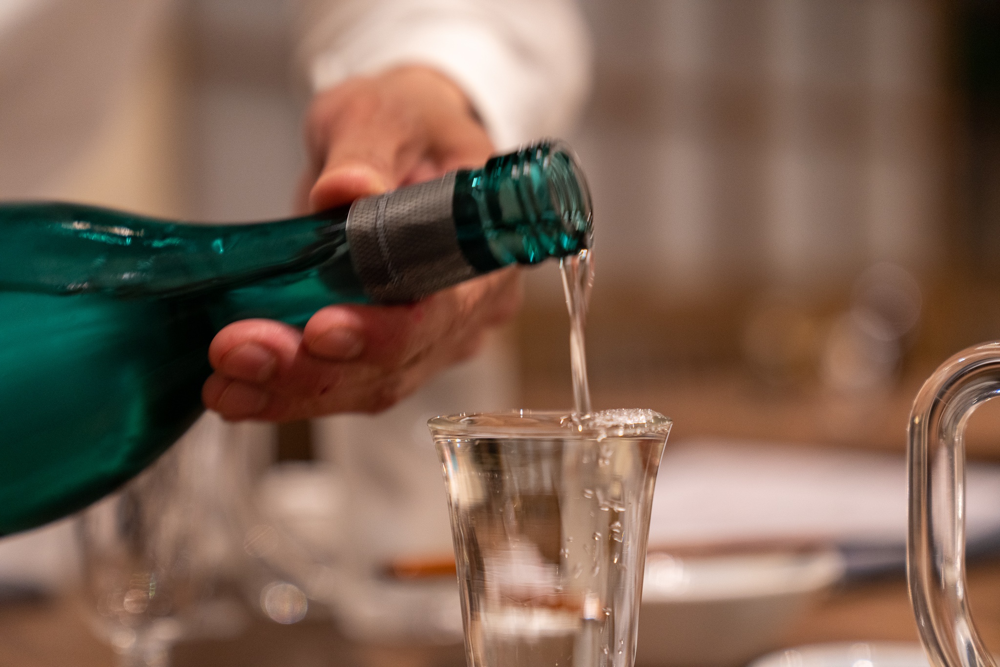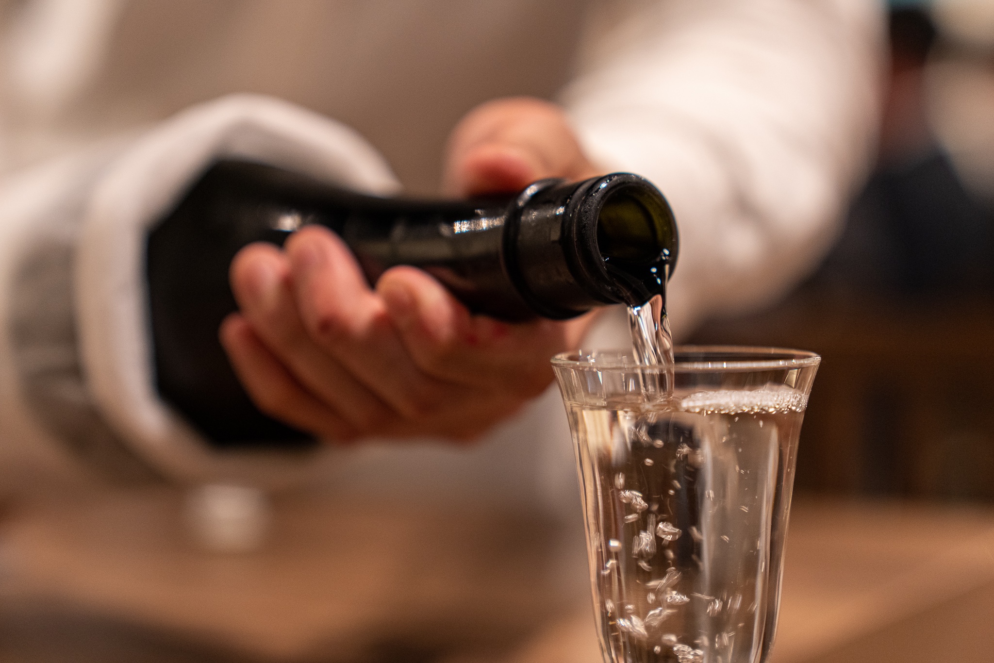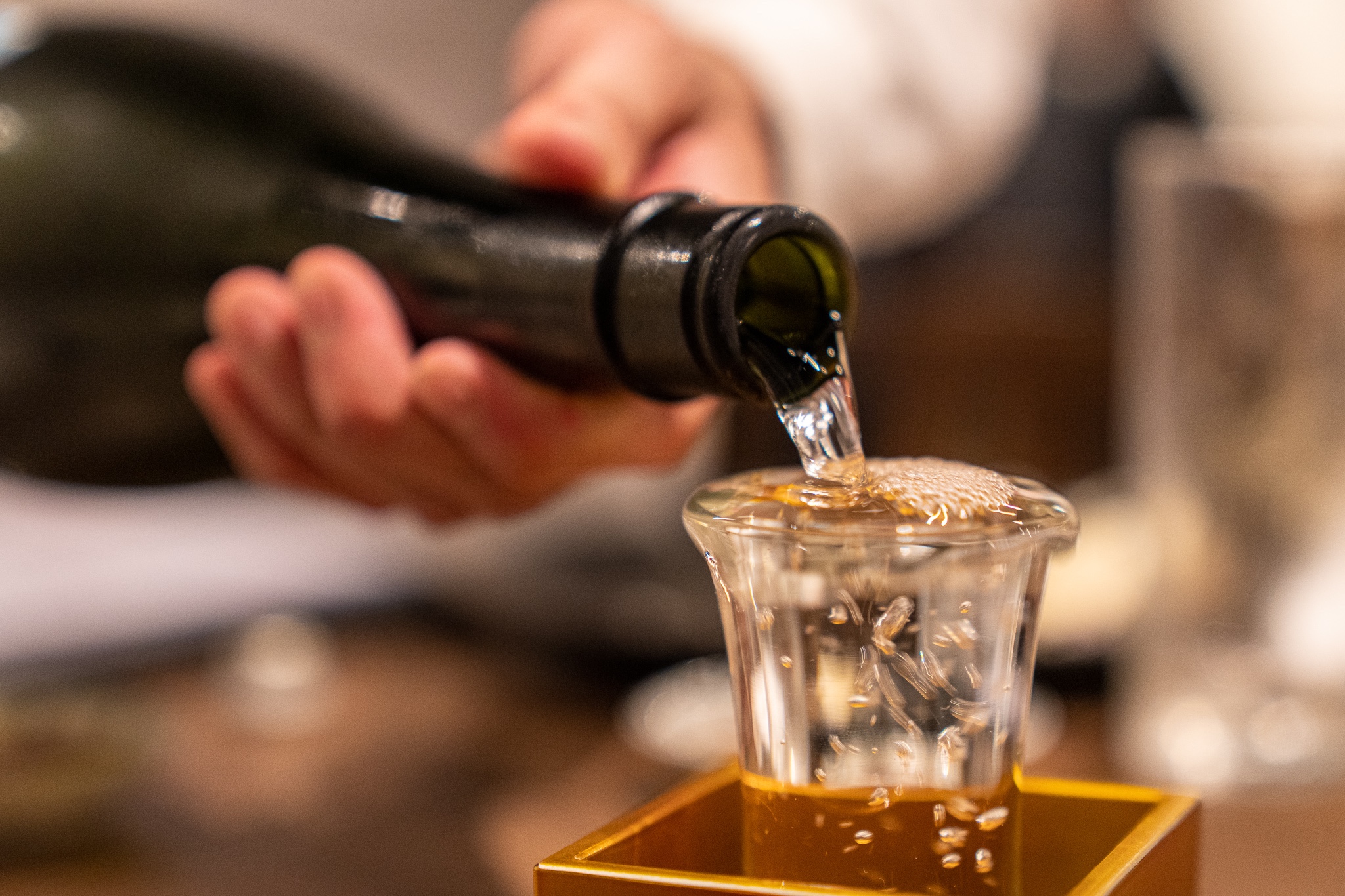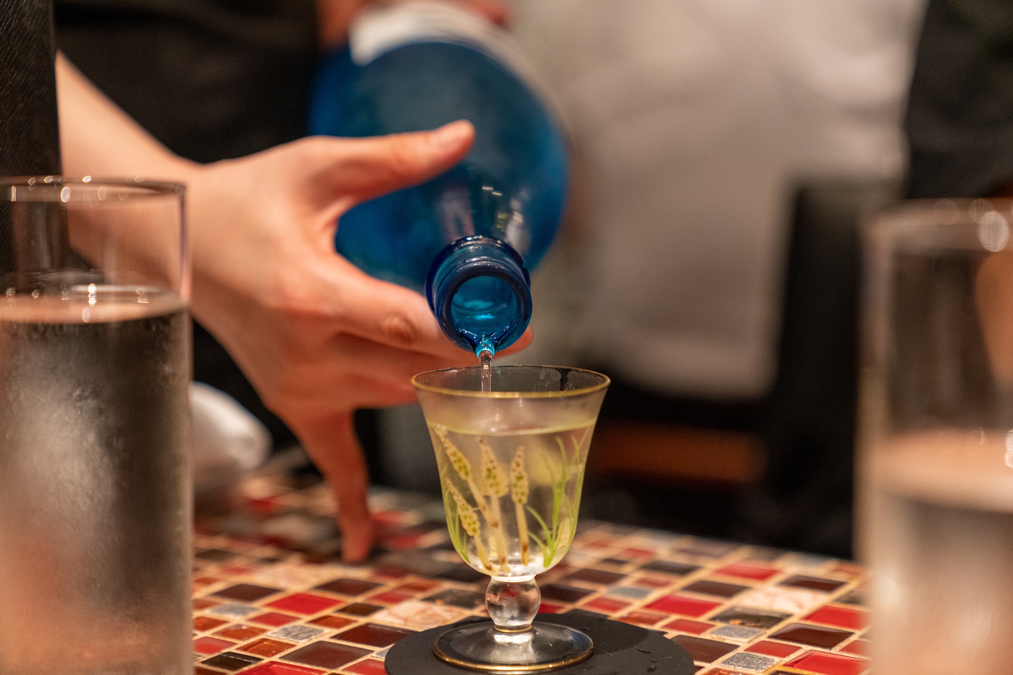 まず一杯目は大好きな而今純米大吟醸!ご主人(たぶん)の酒を注ぐスキルが半端なくて、表面張力を利用して一滴もこぼさずなみなみに入れてくれる!すごい!