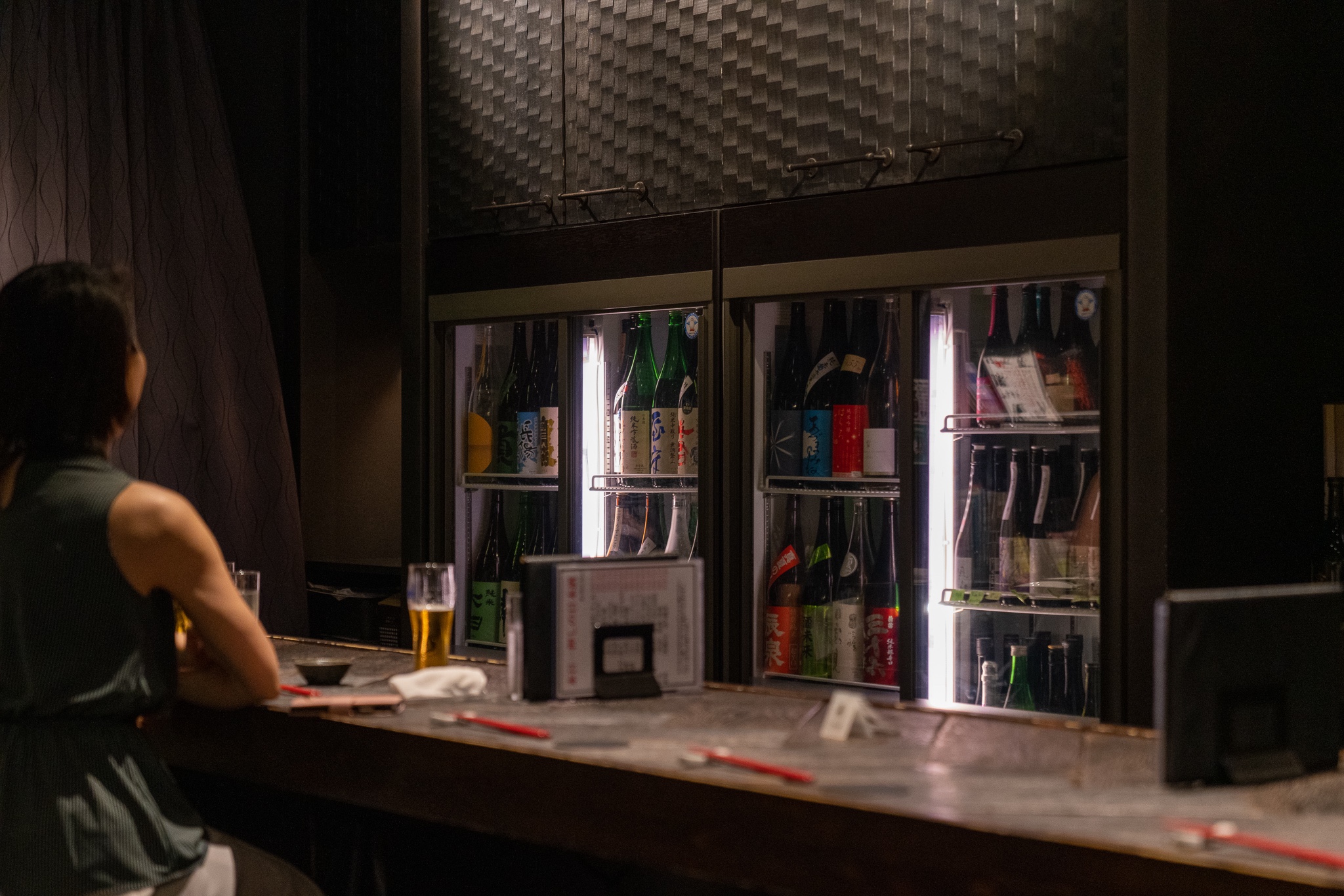 バーカウンターには一面お酒用の冷蔵庫があって写真には映ってないところにも同じくらいサイズの冷蔵庫があってそこにも日本酒がいっぱい!期待もできるし、テンションも上がっちゃう!