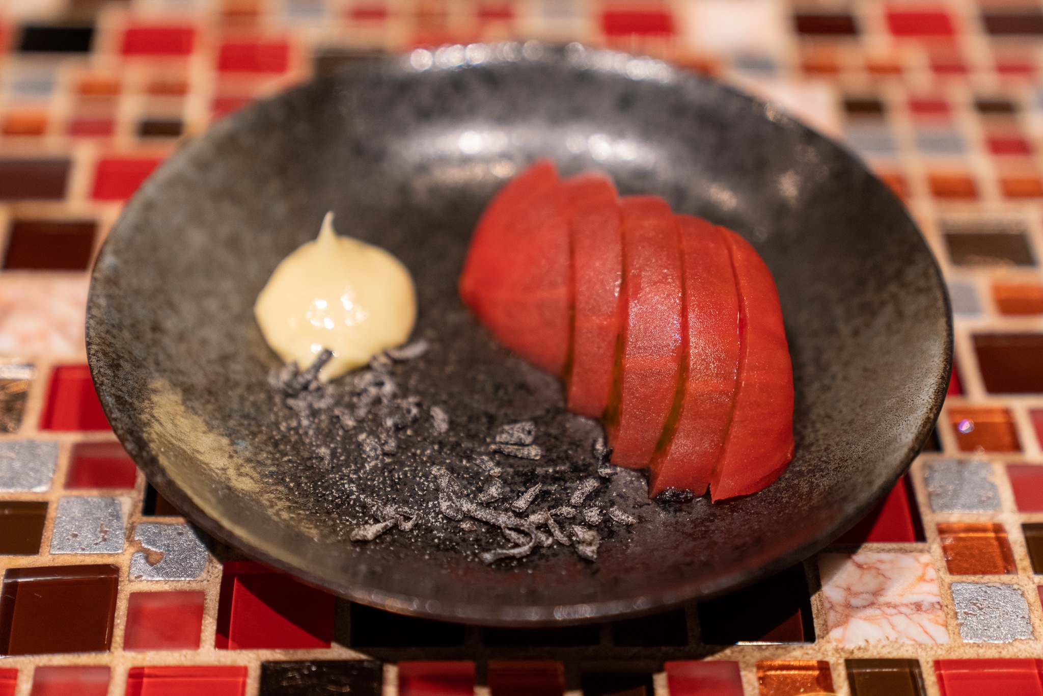 ということで先週後輩たちを連れて魚見茶寮に行ってきた。店内はカウンターのみの13席でコンクリート?モルタル?を基調したモダンな雰囲気は東京カレンダーの表紙でも飾れそう。金曜日ということもあって満席でかなり賑わっていたけど消毒や換気対策なもしっかりしてた。