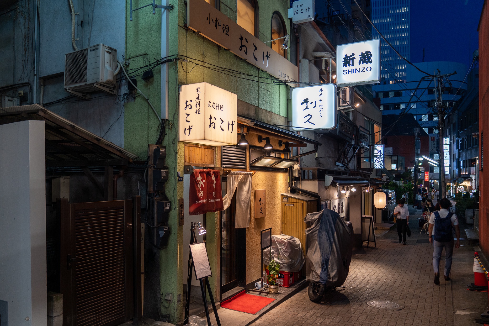 この日のお店は「家庭料理 おこげ」。なかなか渋くていい感じ。暗くなる直前の路地裏の少し寂れた感じとお店の看板の光、後ろの高層ビルの影が混ぜ合わせて素敵な雰囲気だった。