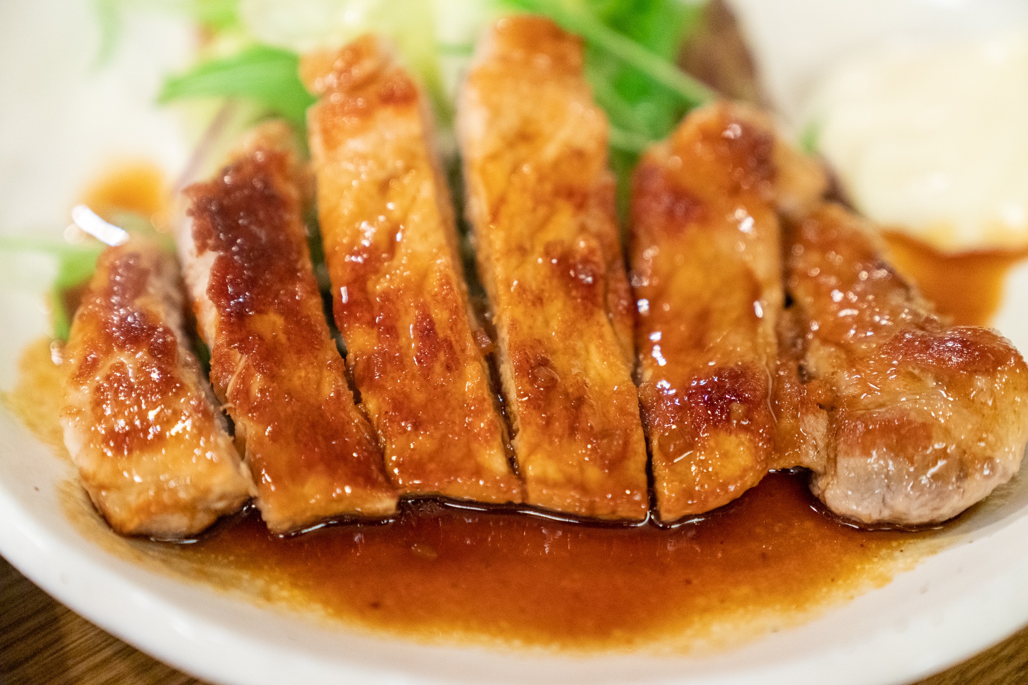 出た!この店の看板メニュー、豚ロスの生姜焼き!厚さはもう生姜焼きのレベルじゃない。これはステーキと言ったほうが相応しいかもね。